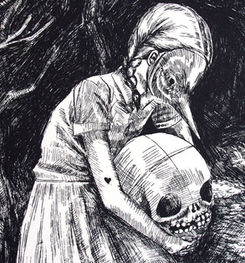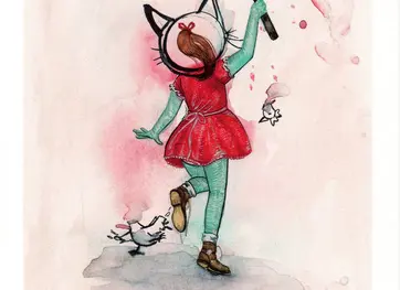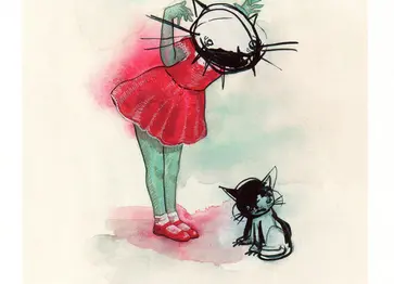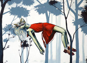 At 22 her work was being exhibited in LA. child-like subjects pluck at adult themes in paintings whose narrative provide all the answers one could expect to find on single page torn from a picture book.